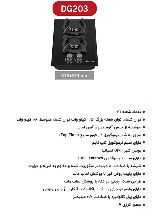 توان شعله: توان شعله بزرگ: 2.5 کیلو وات توان شعله متوسط: 1.8 کیلو وات