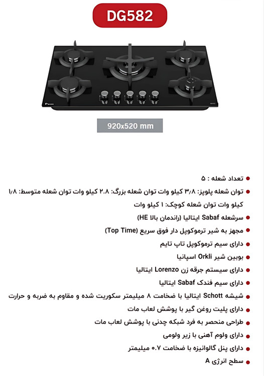 گاز رومیزی پنج شعله داتیس مدل DG-582 با طراحی مدرن و راندمان حرارتی بالا، انتخابی حرفهای برای آشپزخانههای امروزی است. این مدل با شیشه سکوریت شده ۸ میلیمتری Scott ایتالیا، مقاومت بالایی در برابر حرارت و ضربه دارد. سرشعلههای SABA ایتالیا، شیرهای ترموکوپلدار فوق سریع Orkli اسپانیا و سیستم جرقهزن Lorenzo ایتالیا عملکردی دقیق و ایمن را تضمین میکنند. پلوپز با توان ۳.۸، شعله بزرگ ۲.۸، شعله متوسط ۱.۸ و شعله کوچک ۱ کیلووات طراحی شدهاند. فندک و سیم فندک ساخت Sabaf ایتالیا بوده و شبکه چدنی لعابکاری شده با طراحی خاص، همراه با ولومهای آهنی و پنل گالوانیزه ۰.۷ میلیمتری، این گاز را از نظر کیفیت ساخت در سطح بالایی قرار میدهد. دارای پلیت روغنگیر لعابی و رده مصرف انرژی A.
