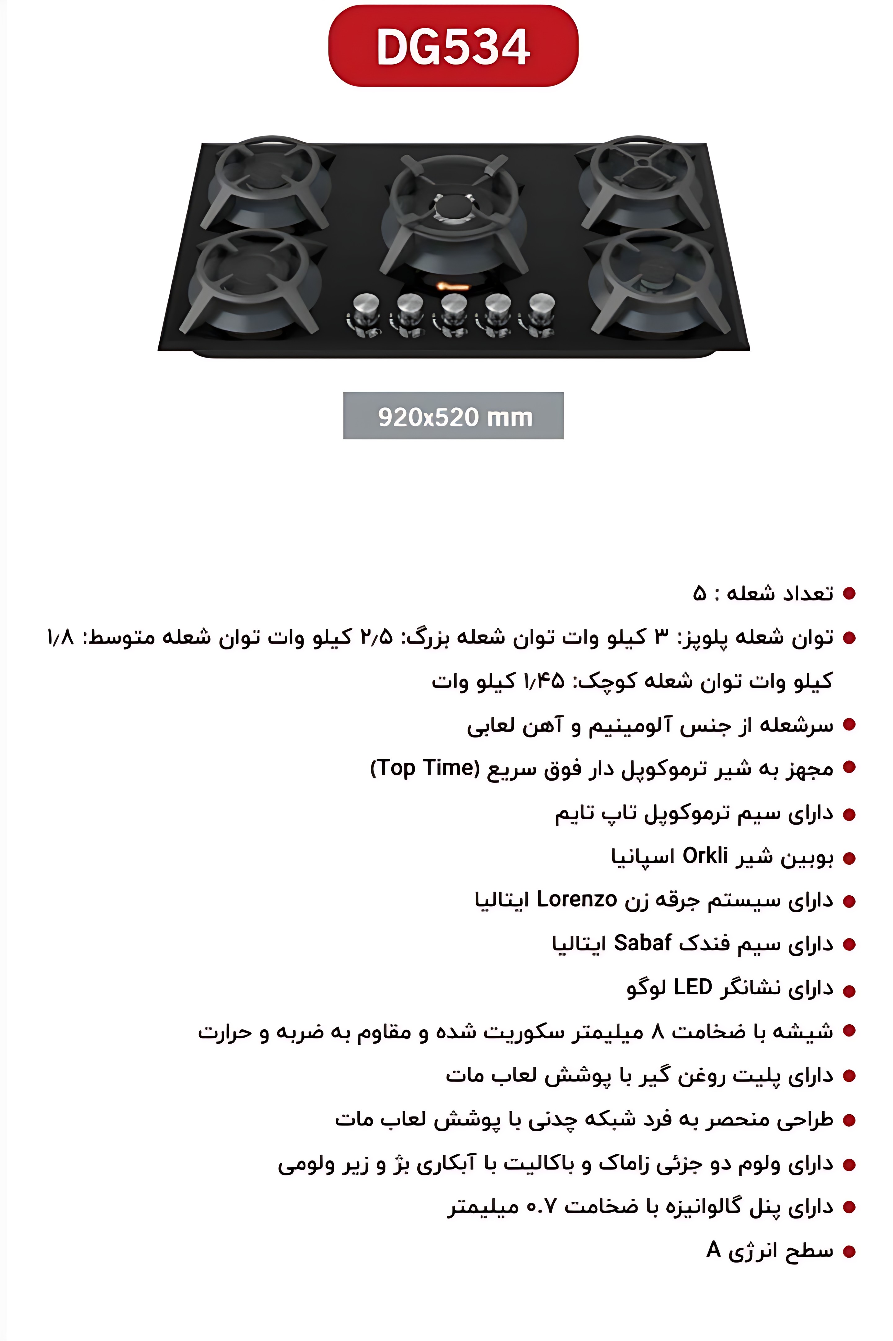 اجاق گاز صفحهای داتیس مدل DG-534 با ۵ شعله قدرتمند، صفحه شیشهای سکوریت ۸ میلیمتری، ترموکوپل فوق سریع Orkli اسپانیا و فندک اتوماتیک Lorenzo ایتالیا، ترکیبی از ایمنی، کیفیت و طراحی مدرن است. دارای شبکه چدنی لعابدار، ولوم دو جزئی با آبکاری براق، مصرف انرژی A و نشانگر LED لوگو. انتخابی حرفهای برای آشپزخانههای امروزی.