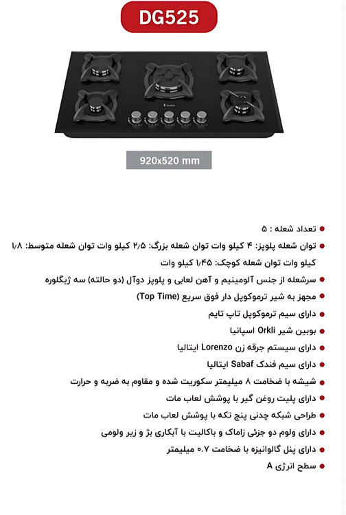 اجاق گاز پنج شعله داتیس مدل ۵۲۵ با شعله پلوپز پرقدرت ۴ کیلووات و شعلههای دیگر با توانهای ۲.۵، ۱.۸ و ۱.۴۵ کیلووات، برای پخت حرفهای طراحی شده است. شعله پلوپز از نوع دوآل (دو حالته سه ژیگلوره) بوده و سرشعلهها از جنس آلومینیوم و آهن لعابی هستند. این مدل مجهز به ترموکوپل فوق سریع (Top Time) با بوبین Orkli اسپانیا، جرقه زن Lorenzo و سیم فندک Sabaf ایتالیا میباشد. شیشه سکوریت ۸ میلیمتری مقاوم به ضربه و حرارت، شبکه چدنی پنجتکه با لعاب مات و پلیت روغنگیر، استحکام و ایمنی بالایی ایجاد میکند. ولومهای دو جزئی زاماک و باکالیت با آبکاری بژ و پنل گالوانیزه ۰.۷ میلیمتری، کیفیت ساخت این اجاق را کامل میکنند. دارای مصرف انرژی سطح A.