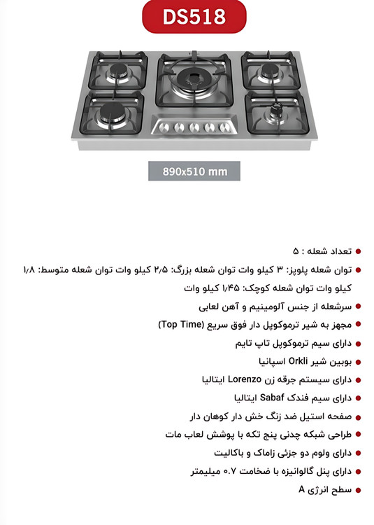 اجاق گاز صفحهای داتیس مدل 518 ترکیبی از طراحی مدرن و عملکرد حرفهای است این گاز استیل است. این گاز دارای ۵ شعله با توان حرارتی مختلف شامل شعله پلوپز ۳ کیلووات، شعله بزرگ ۲.۵ کیلووات، شعله متوسط ۱.۸ کیلووات و شعله کوچک ۱.۴۵ کیلووات است که مناسب برای انواع پختوپز روزمره و حرفهای میباشد. صفحه استیل ضدخش با طراحی کوهاندار و شبکه چدنی پنجتکه با پوشش لعاب مات، دوام و زیبایی را به آشپزخانه شما میآورد. این مدل مجهز به شیر ترموکوپلدار فوق سریع Orkli اسپانیا، سیستم جرقهزن Lorenzo ایتالیا و سیم فندک Sabaf است که ایمنی و کارایی بالایی را تضمین میکند. همچنین ولومهای دو جزئی از جنس زاماک و باکالیت و پنل گالوانیزه ۰.۷ میلیمتری نشاندهنده دقت بالا در طراحی محصول است. داتیس 518 با مصرف انرژی سطح A، انتخابی مطمئن، بادوام و اقتصادی برای هر خانهای است.