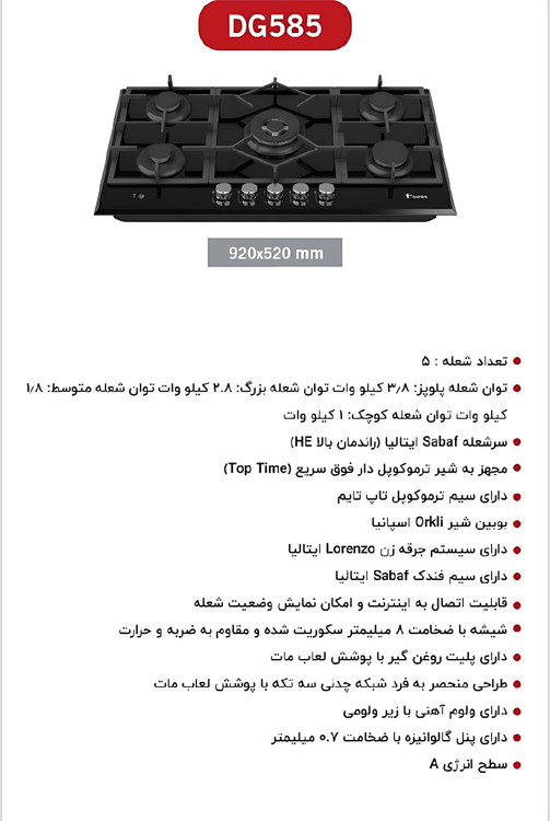 اجاق گاز صفحهای داتیس مدل 585 با طراحی مدرن و کارایی بالا، دارای ۵ شعله با توانهای مختلف است: شعله پلوپز ۳.۸ کیلووات، شعله بزرگ ۲.۸، شعله متوسط ۱.۸ و شعله کوچک ۱ کیلووات. سرشعلههای Saba ایتالیا با راندمان بالا (HE) به همراه شیر ترموکوپلدار فوق سریع Top Time و بوبین شیر Orkli اسپانیا، ایمنی و عملکرد دقیق را تضمین میکنند. سیستم جرقهزن و فندک Saba و Lorenzo ایتالیا کیفیت بالا را تکمیل میکنند. صفحه شیشهای سکوریت ۸ میلیمتری مقاوم در برابر ضربه و حرارت، شبکه چدنی سهتکه با لعاب مات و پلیت روغنگیر از دیگر ویژگیهای این مدل است. همچنین قابلیت اتصال به اینترنت و نمایش وضعیت شعله، آن را به گزینهای هوشمند و پیشرفته تبدیل کرده است. ولومهای آهنی با زیرولوم و پنل گالوانیزه ۰.۷ میلیمتری نشاندهنده دقت در طراحی است. مصرف انرژی این گاز در سطح A قرار دارد.