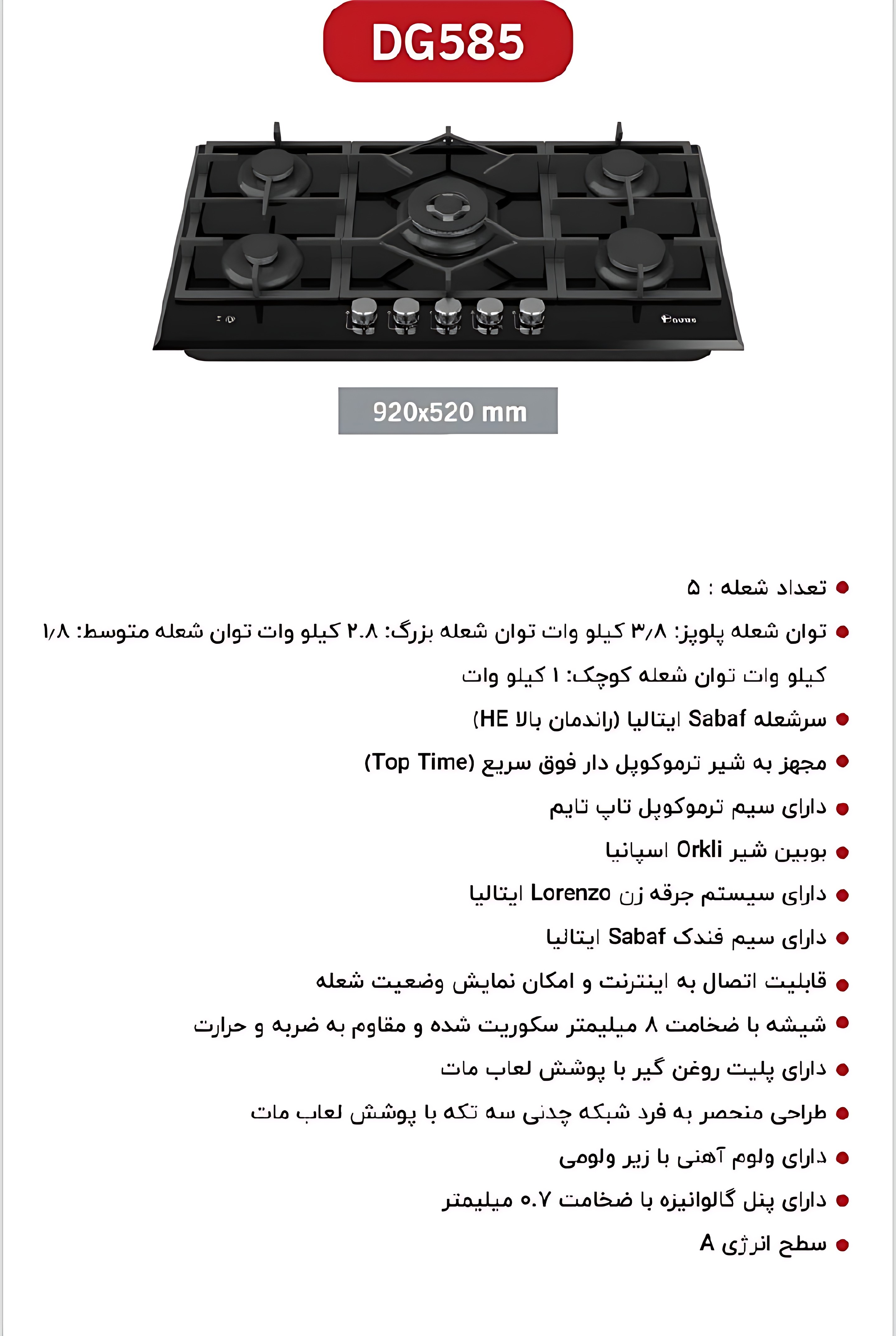 اجاق گاز صفحهای داتیس مدل 585 با طراحی مدرن و کارایی بالا، دارای ۵ شعله با توانهای مختلف است: شعله پلوپز ۳.۸ کیلووات، شعله بزرگ ۲.۸، شعله متوسط ۱.۸ و شعله کوچک ۱ کیلووات. سرشعلههای Saba ایتالیا با راندمان بالا (HE) به همراه شیر ترموکوپلدار فوق سریع Top Time و بوبین شیر Orkli اسپانیا، ایمنی و عملکرد دقیق را تضمین میکنند. سیستم جرقهزن و فندک Saba و Lorenzo ایتالیا کیفیت بالا را تکمیل میکنند. صفحه شیشهای سکوریت ۸ میلیمتری مقاوم در برابر ضربه و حرارت، شبکه چدنی سهتکه با لعاب مات و پلیت روغنگیر از دیگر ویژگیهای این مدل است. همچنین قابلیت اتصال به اینترنت و نمایش وضعیت شعله، آن را به گزینهای هوشمند و پیشرفته تبدیل کرده است. ولومهای آهنی با زیرولوم و پنل گالوانیزه ۰.۷ میلیمتری نشاندهنده دقت در طراحی است. مصرف انرژی این گاز در سطح A قرار دارد.